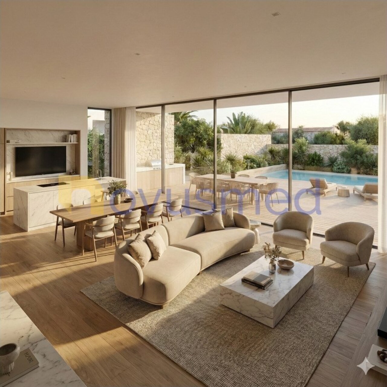 Le projet prévoit une implantation de plain-pied, afin de privilégier le confort et la fonctionnalité. Une partie de la maison et toute la zone de la piscine sont orientées vers le sud, garantissant une excellente exposition au soleil tout au long de la journée, ce qui est un facteur positif pour profiter de l'espace extérieur.