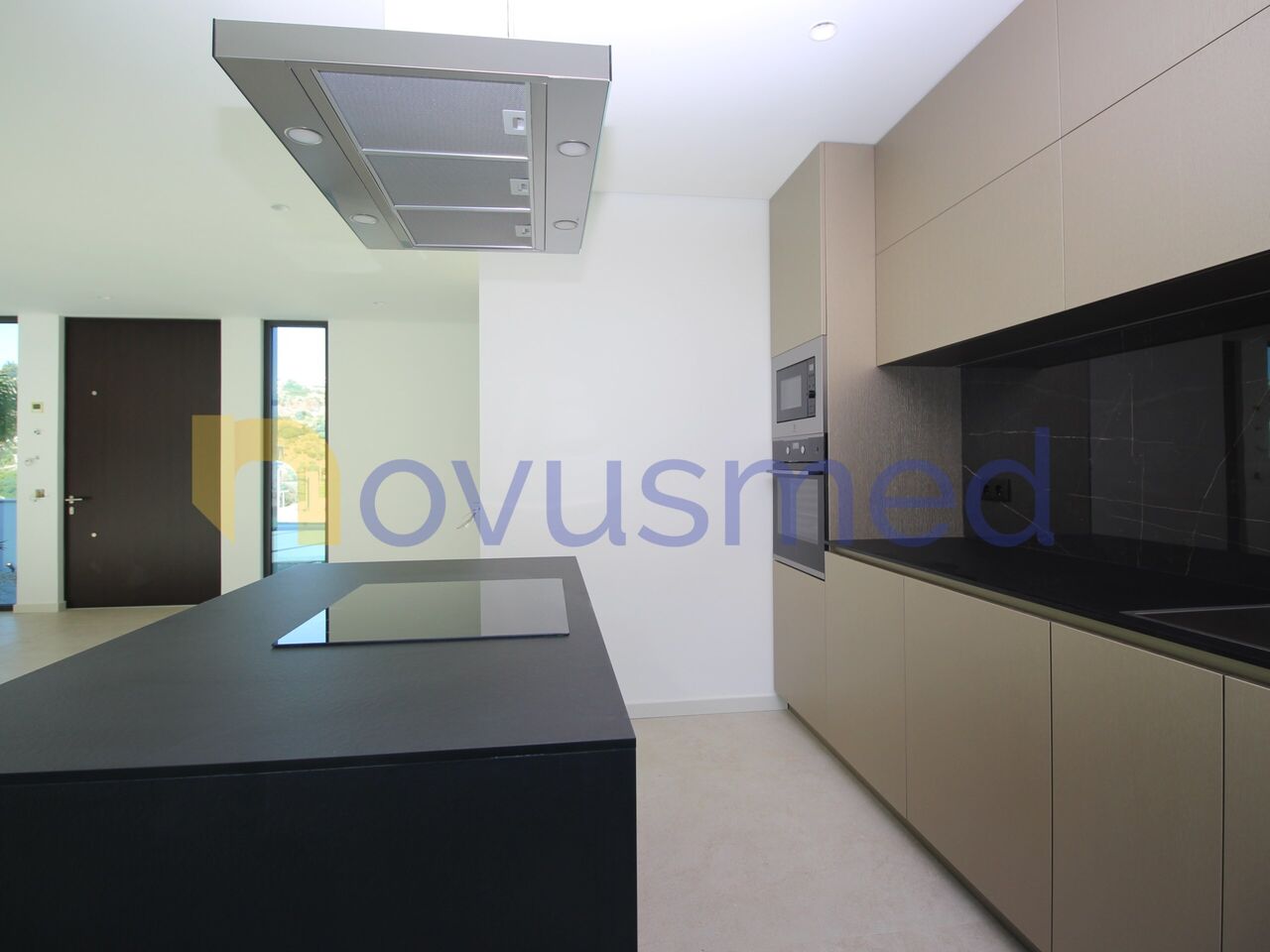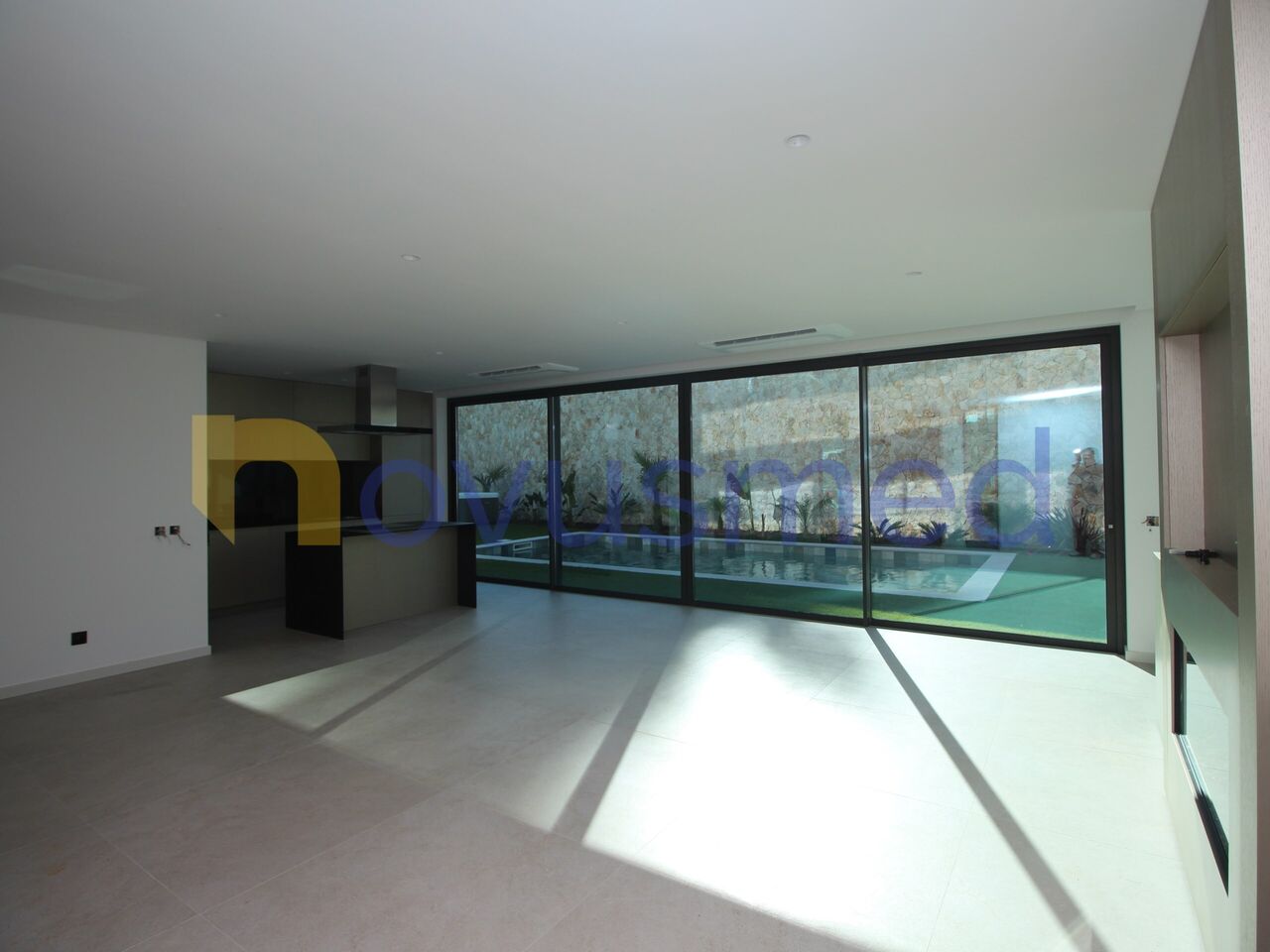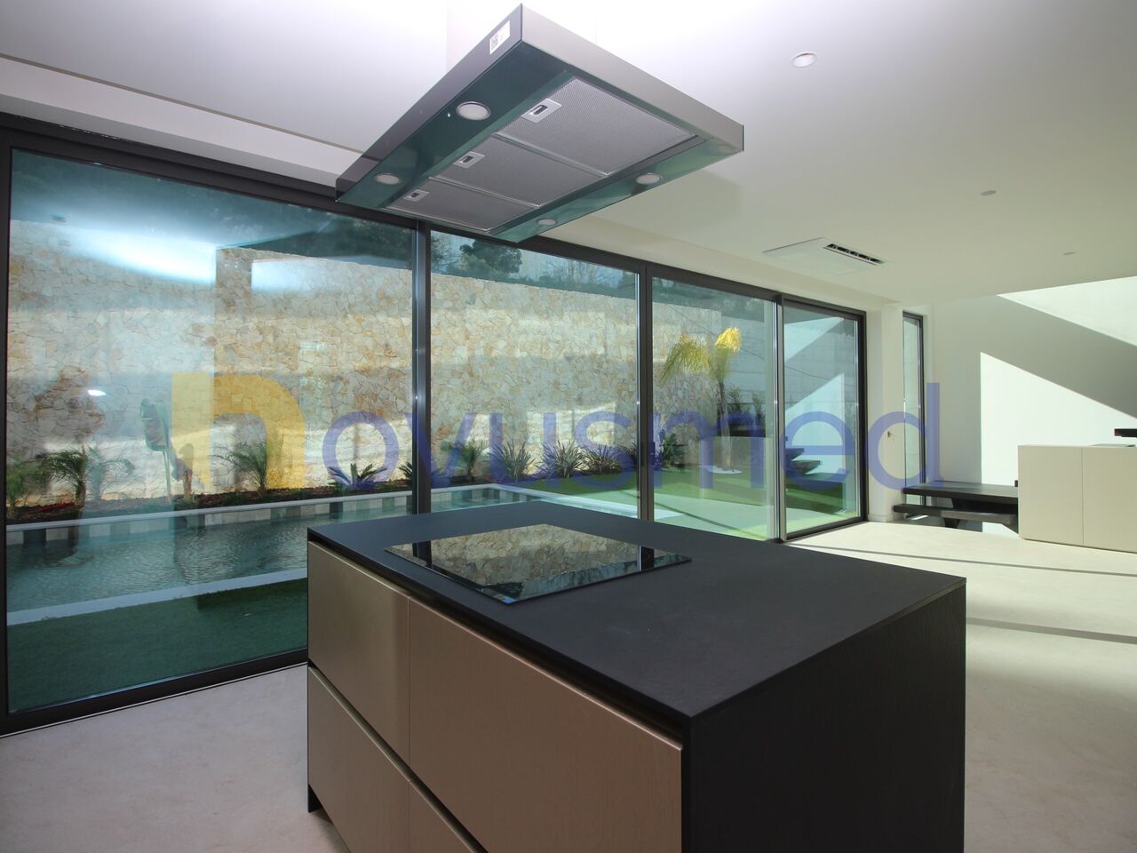 Когда мы входим в виллу, мы можем увидеть большую гостиную в открытом пространстве с этанольным камином, гармонично соединяющимся с интегрированной кухней, полностью оборудованной современной и эффективной бытовой техникой.
