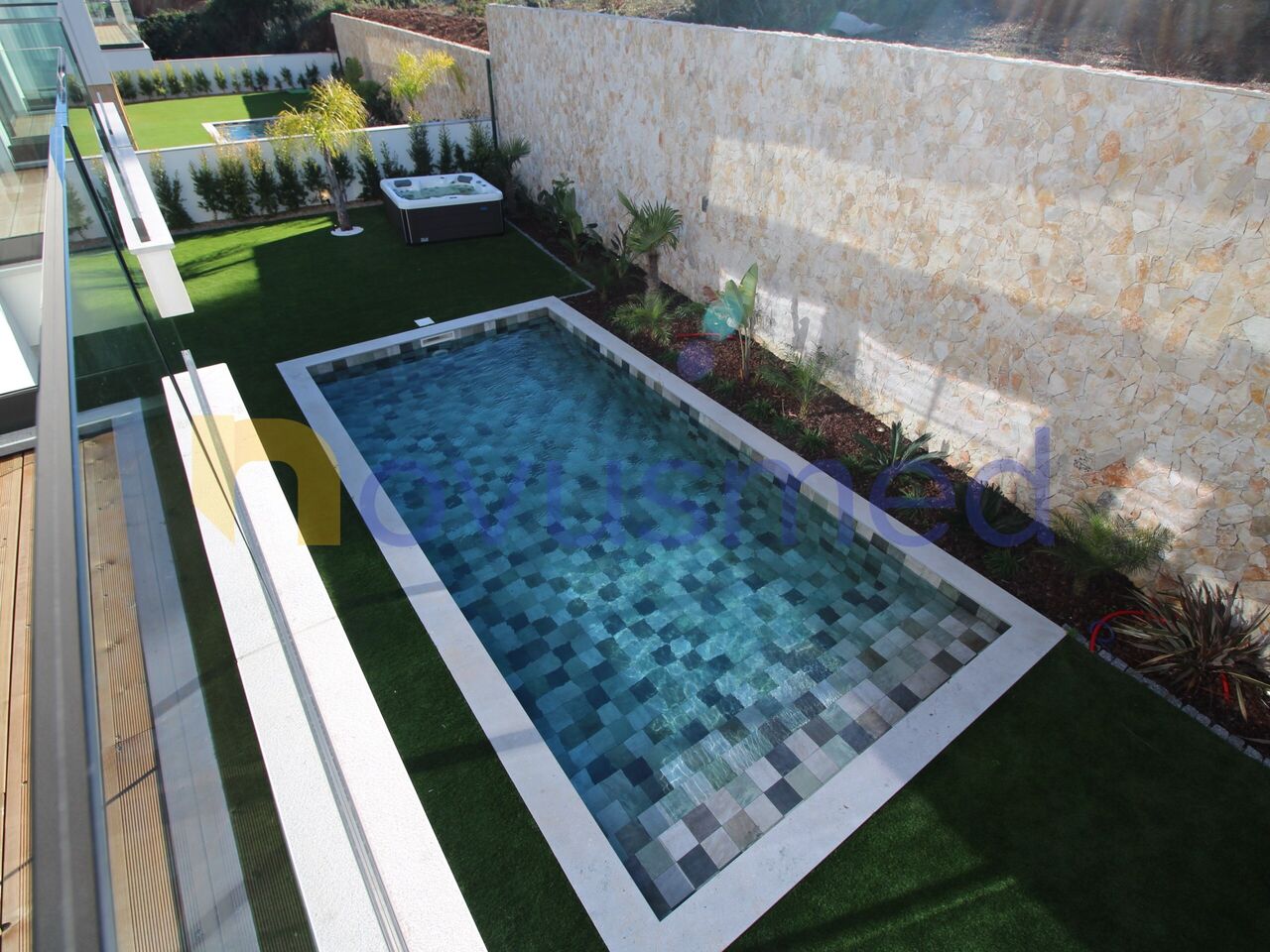 На улице есть 2 парковочных места, частный бассейн, джакузи, сад с искусственной травой, кустарники по периметру, пальмы и растения, с автоматическим орошением и освещением.
